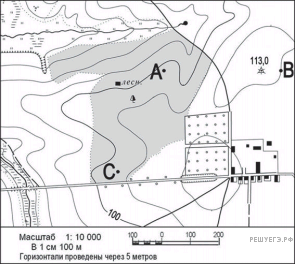 Для определения расстояния надо измерить линейкой расстояние от дома лесника до точки С.. Затем перевести в метры, умножив на величину масштаба (в 1 см — 100 м.)