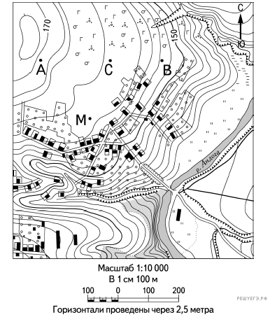 В 1 см карты — 100 метров, поэтому что бы получить ответ в метрах, расстояние между заданными точками, измеренное в сантиметрах, необходимо умножить на 100.