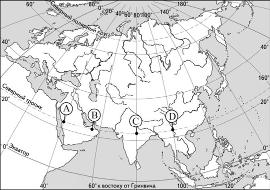 Версия для печати и копирования в MS WordОпределите, в каком из пунктов, обозначенных буквами на карте Евразии, Солнце будет находиться выше всего над горизонтом 1 декабря в 8 часов по солнечному времени Гринвичского меридиана. Запишите обоснование Вашего ответа.