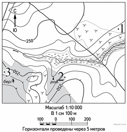 С помощью карты сравните абсолютные высоты точек, обозначенных на карте цифрами 1, 2 и 3. Расположите эти точки в порядке увеличения их абсолютных высот.