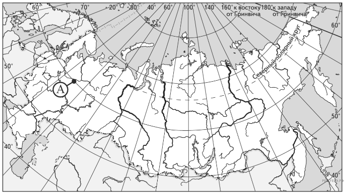 Какие географические координаты имеет точка, обозначенная на карте России буквой А?