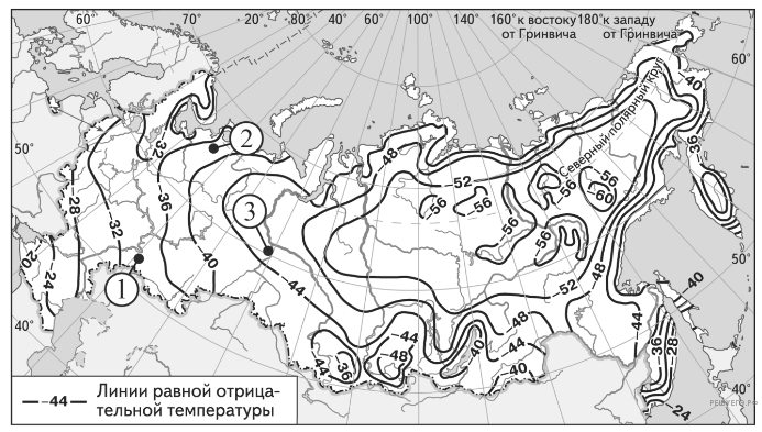 С помощью карты сравните значения средних многолетних минимумов температуры воздуха в точках, обозначенных на карте цифрами 1, 2, 3. Расположите точки в порядке повышения температур.
