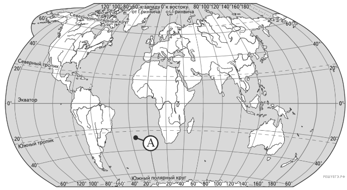 Какие географические координаты имеет точка, обозначенная на карте мира буквой А?