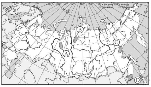 Какая из территорий, обозначенных буквами на карте России, находится в пределах природной зоны тундры?