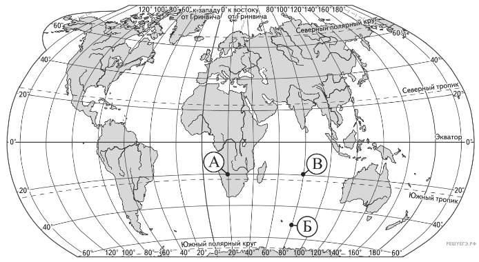 Определите, в какой из точек, обозначенных буквами на карте мира, 12 июля солнце будет находиться выше всего над горизонтом в 7 часов по солнечному времени Гринвичского меридиана. Запишите обоснование Вашего ответа.