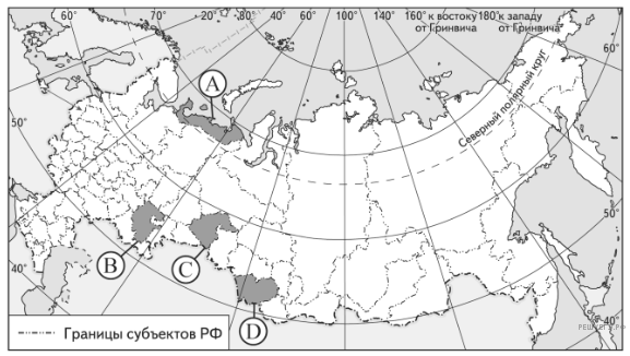 В каком из регионов, обозначенных буквами на карте России, средняя плотность населения наименьшая?