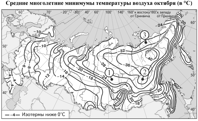 С помощью карты сравните значения средних многолетних минимумов температуры воздуха в октябре в точках, обозначенных на карте цифрами 1, 2, 3. Расположите точки в порядке повышения температур.