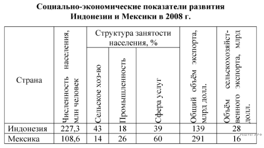 Используя данные таблицы, приведённой ниже, сравните доли населения, занятого в сельском хозяйстве, и доли сельского хозяйства в общем объёме экспорта Индонезии и Мексики. Сделайте вывод о том, в какой из этих стран сельское хозяйство играет большую роль в экономике. Для обоснования своего ответа запишите необходимые числовые данные или вычисления.