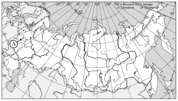 Какие географические координаты имеет точка, обозначенная на карте России буквой А?