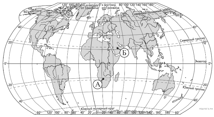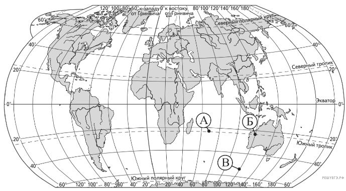 Определите, в какой из точек, обозначенных буквами на карте мира, 5 апреля солнце будет находиться выше всего над горизонтом в 4 часа по солнечному времени Гринвичского меридиана. Запишите обоснование Вашего ответа.