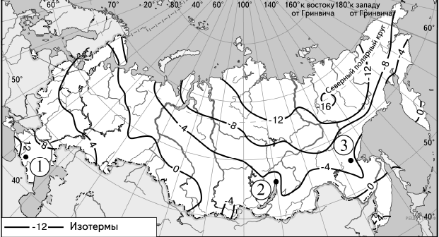 С помощью карты сравните среднегодовые температуры воздуха в точках, обозначенных на карте цифрами 1, 2 и 3. Расположите эти точки в порядке повышения температуры воздуха.