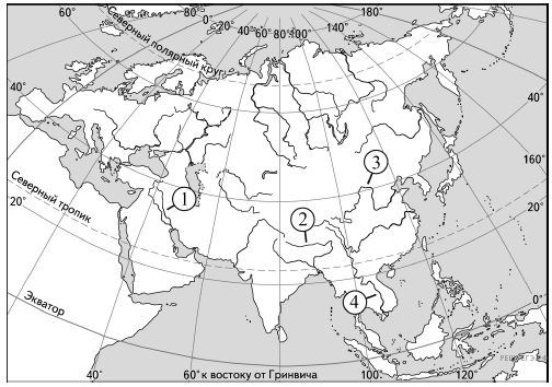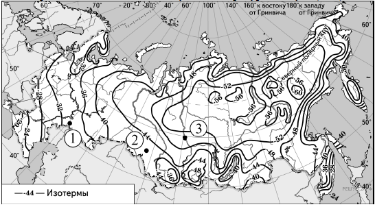 С помощью карты сравните значения средних многолетних минимумов температуры воздуха в точках, обозначенных на карте цифрами 1, 2 и 3. Расположите эти точки в порядке повышения этих значений.