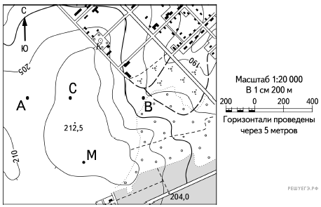 Определите по карте расстояние на местности по прямой от точки А до точки М. Полученный результат округлите до десятков метров. Ответ запишите в виде числа.