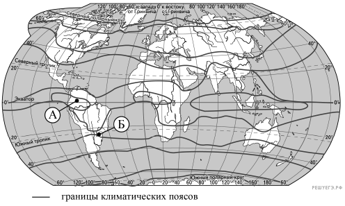Определите, в каком из пунктов, обозначенных буквами А и Б на карте мира, в декабре количество суммарной солнечной радиации на 1 см2 земной поверхности будет меньше. Для обоснования Вашего ответа приведите два довода.