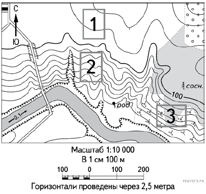 Определите, в пределах какого из участков, обозначенных на фрагменте карты цифрами, существует наибольшая опасность развития водной эрозии почвенного слоя.