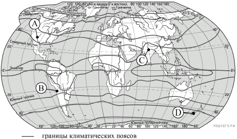 Какой из пунктов, обозначенных буквами на карте мира, расположен в субтропическом климатическом поясе?
