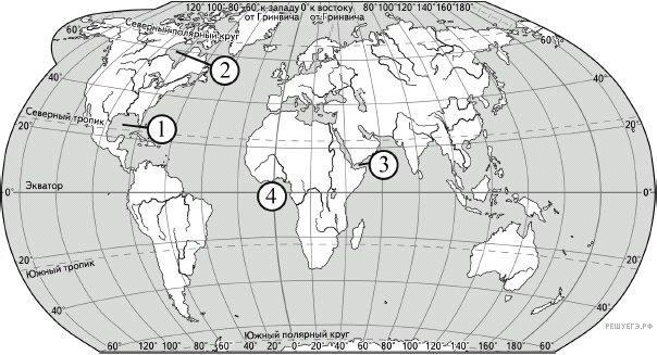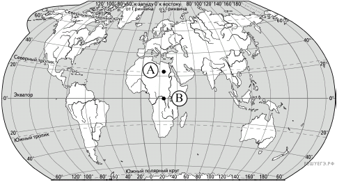 Определите, в каком из пунктов, обозначенных буквами на карте мира, в июле количество суммарной солнечной радиации на 1 см2 земной поверхности будет больше. Для обоснования Вашего ответа приведите два довода. Если Вы приведёте более двух доводов, оцениваться будут только два, указанных первыми.