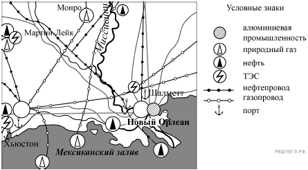 Используя представленную карту, объясните размещение в г. Шалметт (побережье Мексиканского залива в США) алюминиевого завода. Укажите две причины. Если Вы укажете более двух причин, оцениваться будут только две, указанные первыми.