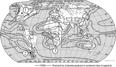 С помощью карты сравните среднегодовое количество атмосферных осадков в точках, обозначенных на карте цифрами 1, 2, 3. Расположите эти точки в порядке увеличения количества осадков, выпадающих в них.