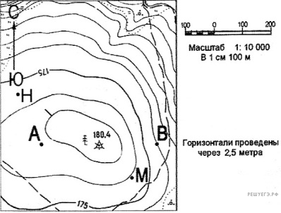 Постройте профиль рельефа местности по линии М−Н. Для этого перенесите основу для построения профиля на бланк ответов, используя горизонтальный масштаб (в 1 см — 100 м) и вертикальный масштаб (в 1 см — 5 м).