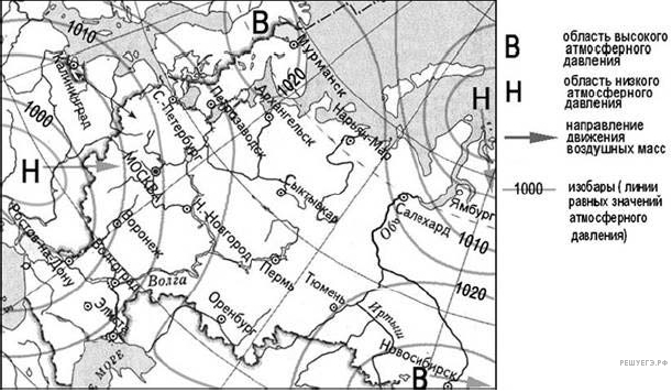 В пунктах, обозначенных на рисунке цифрами, одновременно проводятся измерения атмосферного давления. Расположите эти пункты в порядке повышения в них атмосферного давления (от наиболее низкого к наиболее высокому).