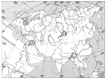 Какой буквой на карте Евразии обозначена точка с наименьшей высотой над уровнем моря?
