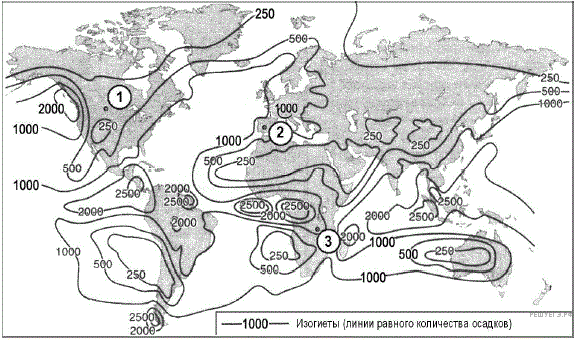 С помощью карты сравните среднегодовое количество атмосферных осадков в точках, обозначенных на карте цифрами 1, 2, 3. Расположите эти точки в порядке увеличения количества осадков, выпадающих в них.