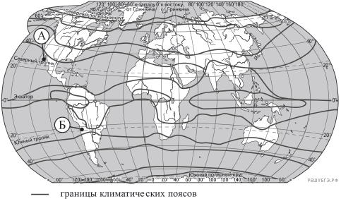Определите, в каком из пунктов, обозначенных на карте мира буквами А и Б, в декабре количество суммарной солнечной радиации на 1 см2 земной поверхности будет больше. Для обоснования Вашего ответа приведите два довода.