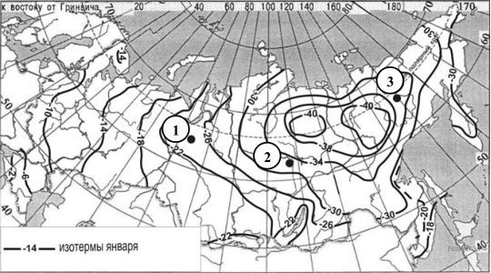 С помощью карты сравните средние температуры воздуха января в точках, обозначенных на карте цифрами 1, 2, 3. Расположите эти точки в порядке повышения температуры.