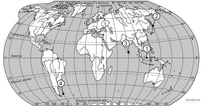 Определите, в какой из точек, географические координаты которых указаны в таблице, 15 августа Солнце раньше [по времени Гринвичского меридиана] поднимется над горизонтом. Запишите обоснование Вашего ответа.