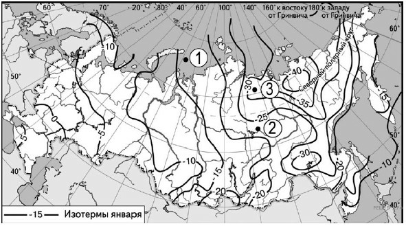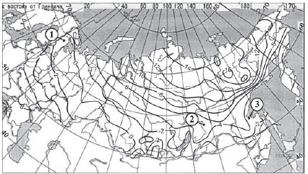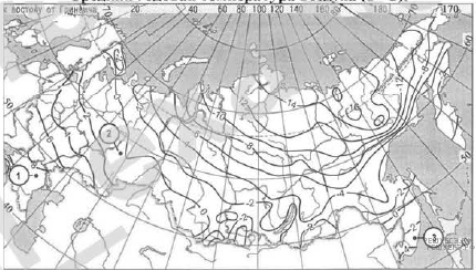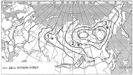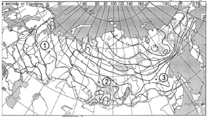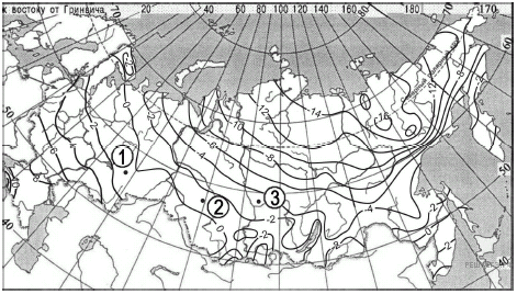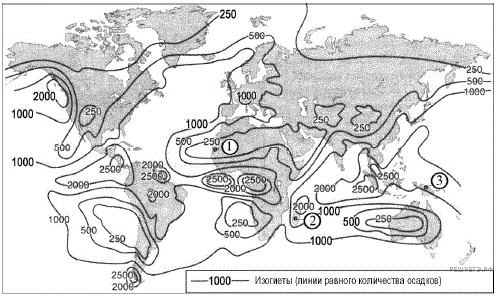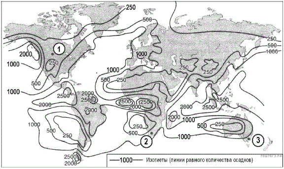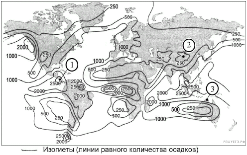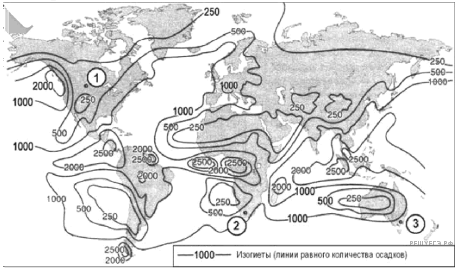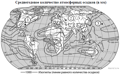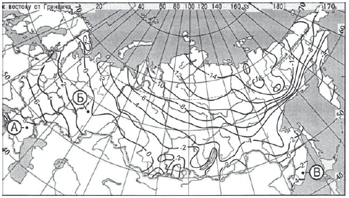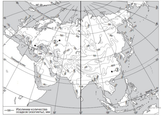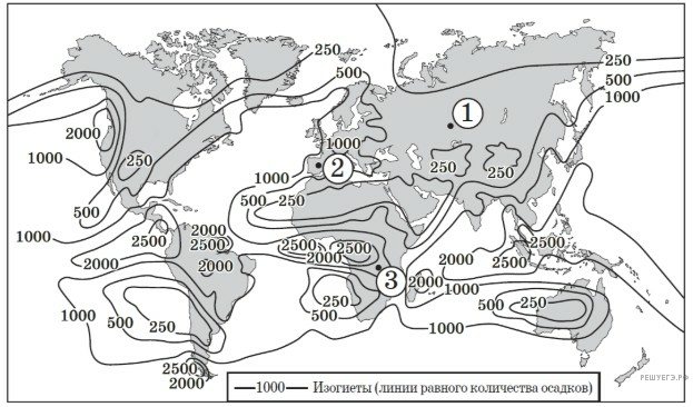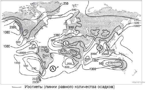 С помощью карты сравните среднегодовое количество атмосферных осадков в точках, обозначенных на карте буквами А, Б, В. Расположите эти точки в порядке увеличения количества осадков, выпадающих в них.