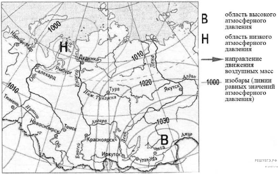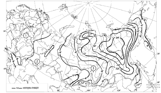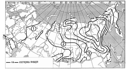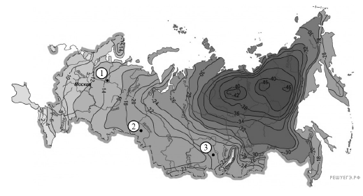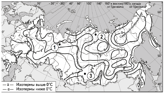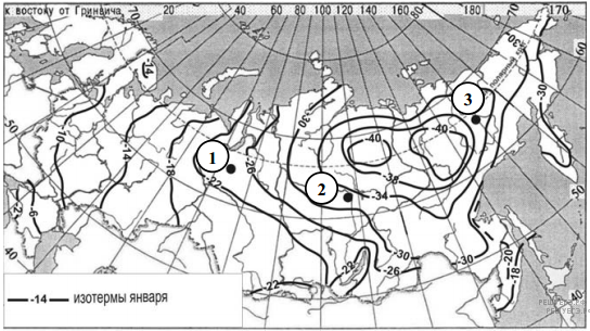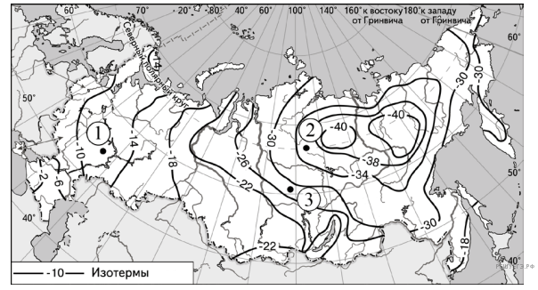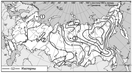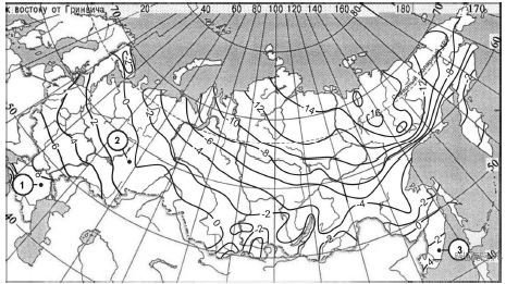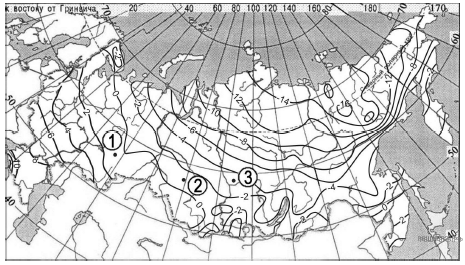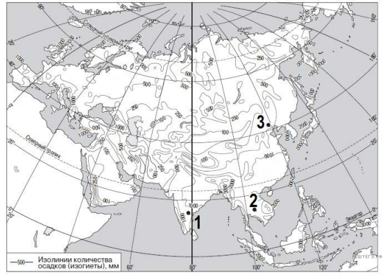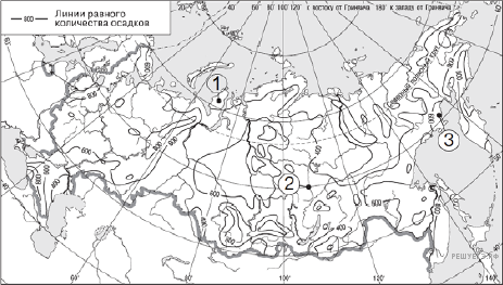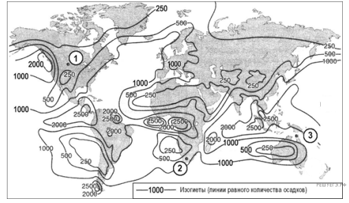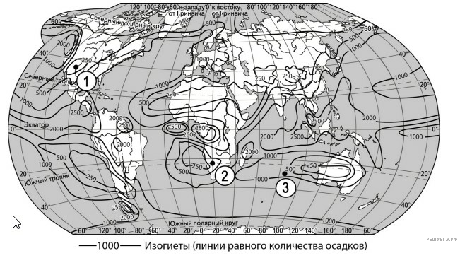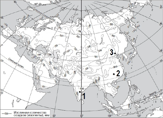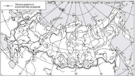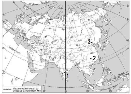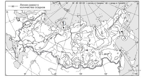 С помощью карты сравните среднегодовое количество осадков в точках, обозначенных на карте буквами А, Б, В. Расположите эти точки в порядке увеличения количества осадков, выпадающих в них.