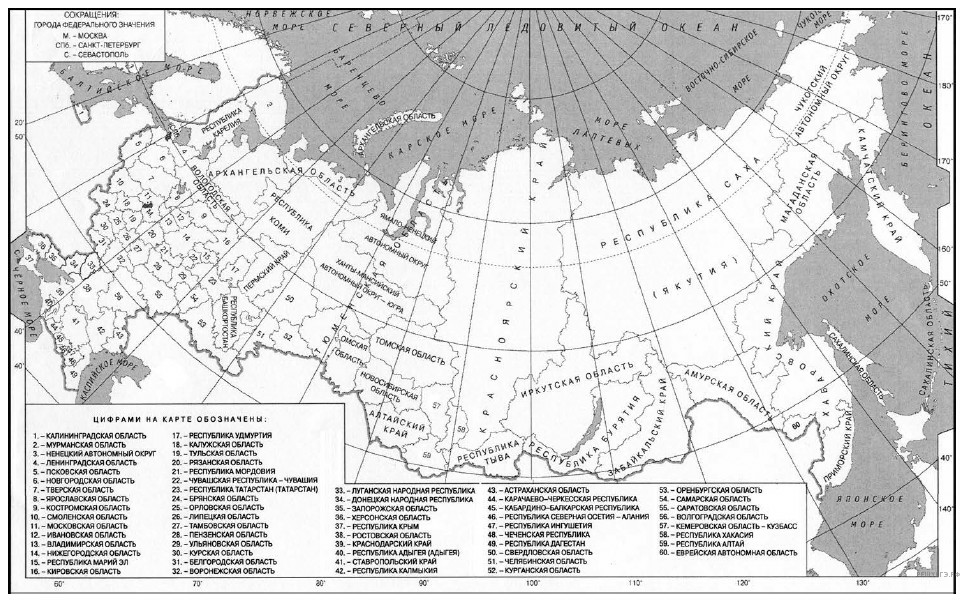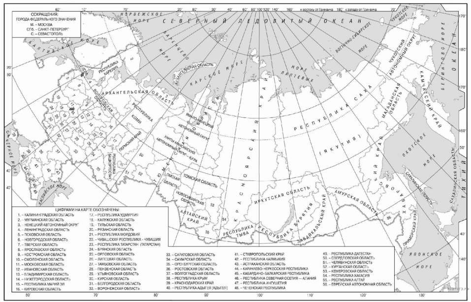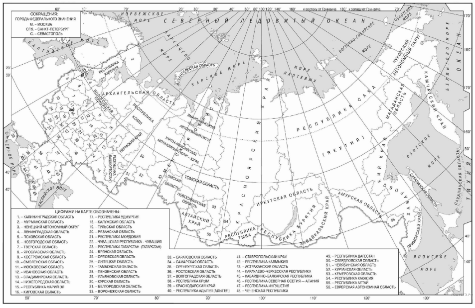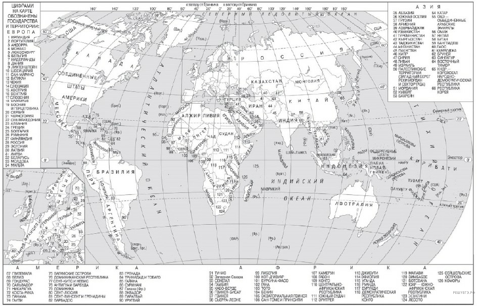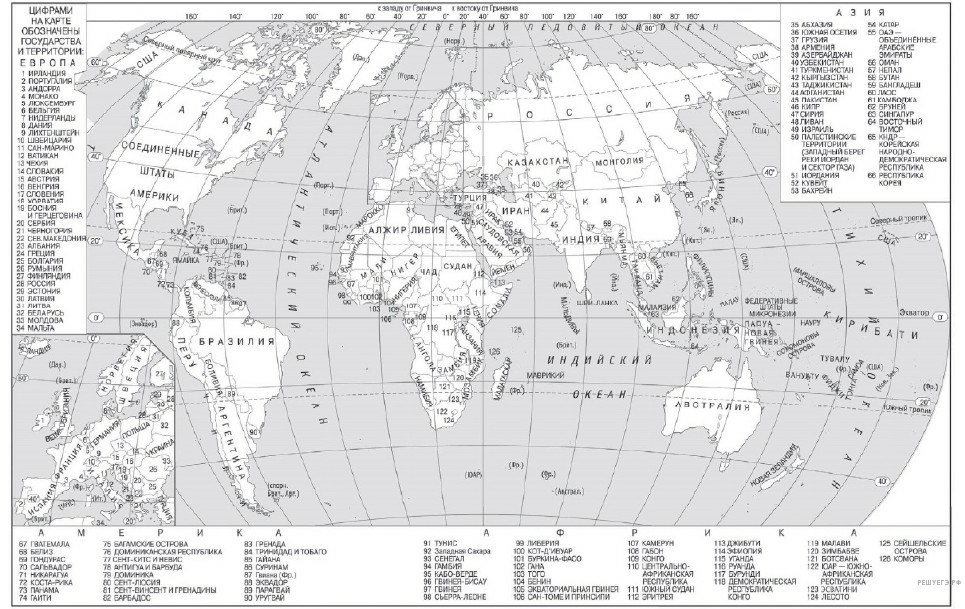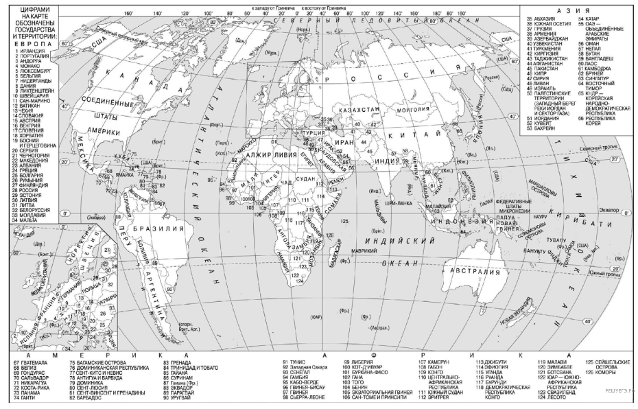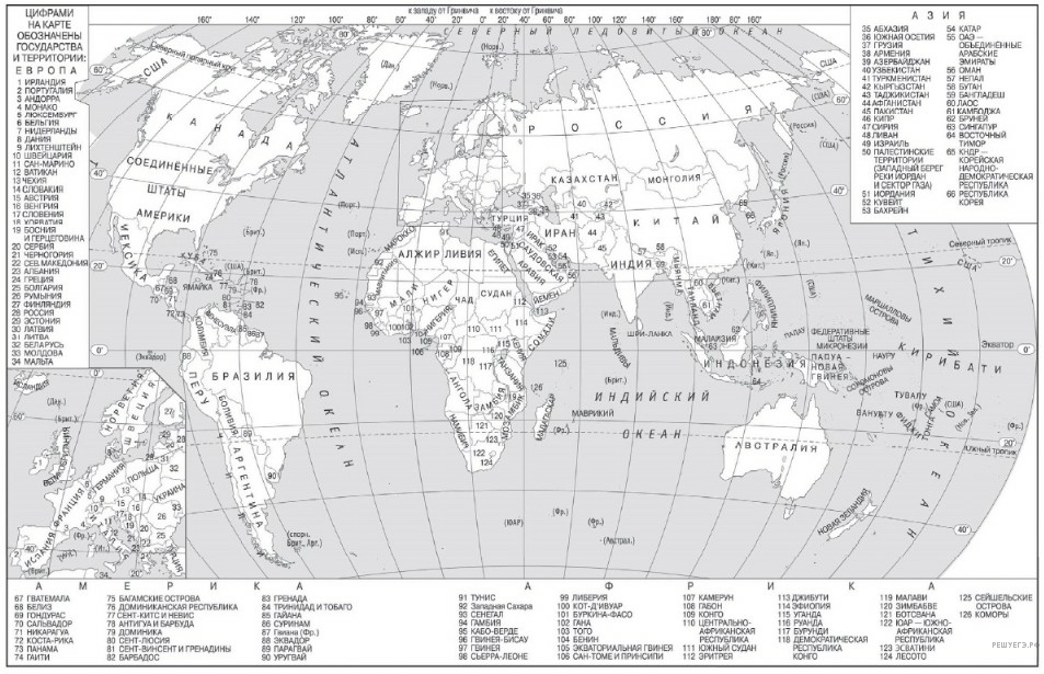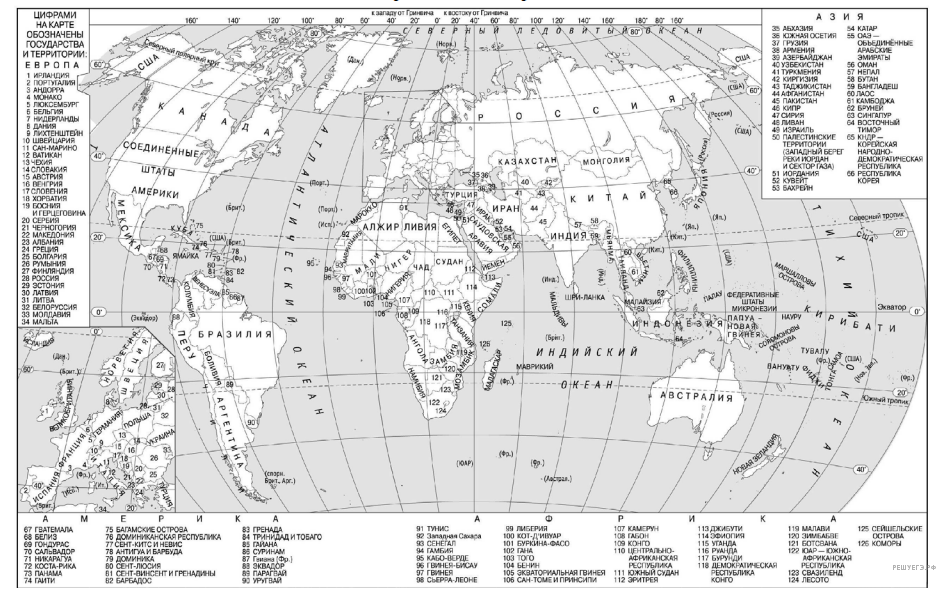 Пояснение. Решая задания данного типа, следует помнить, что значения широты подписаны на линиях параллелей, а значения долготы — на линиях меридианов. Широта есть расстояние в градусах от экватора. Она бывает северной и южной, а долгота — расстояние от нулевого меридиана (или Гринвичского меридиана). Долгота бывает западной и восточной. Пересечение линий широты и долготы даст искомую точку. Надо лишь прочесть название государства. На данной карте (карта мира и карта России, которые выдаются на экзамене в качестве справочного материала) между двумя параллелями и двумя меридианами — 10 или 20 градусов, то есть надо мысленно разделить расстояние на 10 или 20. Минутами, данными в задании, можно пренебречь.