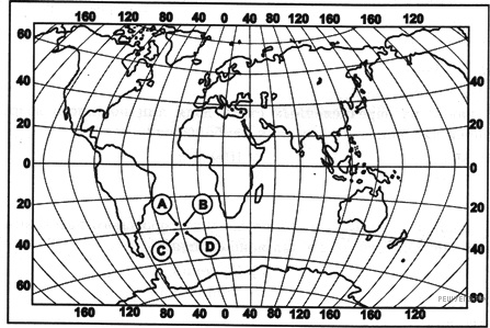 Какой буквой на карте мира обозначена точка, имеющая координаты 35° ю. ш. и 17° з. д.?