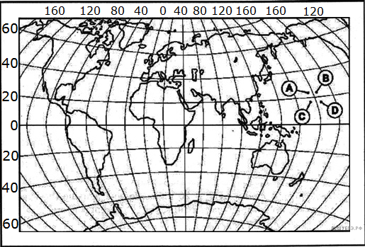 Какой буквой на карте мира обозначена точка, имеющая координаты 24° с. ш. и 176° в. д.?
