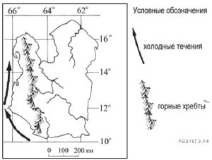 На картосхеме изображён остров, расположенный в тропических широтах. Объясните, почему на западном побережье этого острова выпадает наименьшее количество атмосферных осадков. Укажите две причины. Если Вы укажете более двух причин, оцениваться будут только две, указанные первыми.