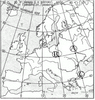Определите, в каком из пунктов, обозначенных буквами на карте Европы, 19 декабря солнце раньше по солнечному времени Гринвичского меридиана поднимется над горизонтом. Запишите обоснование Вашего ответа.