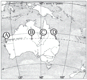 Определите, в каком из пунктов, обозначенных буквами на карте Австралии, 23 сентября солнце будет находиться ниже всего над горизонтом в 4 часа утра по солнечному времени Гринвичского меридиана. Запишите обоснование Вашего ответа.