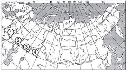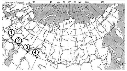 Определите, в каком из пунктов, обозначенных цифрами на карте, 1 августа солнце будет находиться ниже всего над горизонтом в 9 часов по солнечному времени Гринвичского меридиана. Запишите обоснование своего ответа.