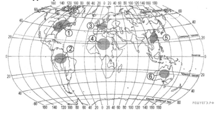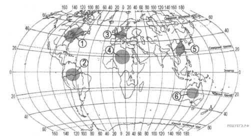 Какие три из обозначенных на карте территорий расположены в наиболее густонаселенных регионах мира? Запишите в ответ цифры в порядке возрастания, под которыми указаны эти территории.
