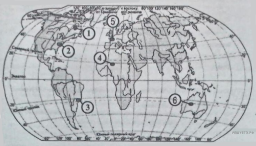 Какие три из обозначенных на карте мира территорий имеют наименьшую среднюю плотность населения? Запишите в таблицу цифры, под которыми указаны эти территории.