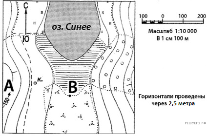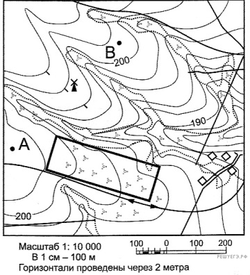 Ознакомьтесь с картой, показанной на рисунке. Постройте профиль рельефа местности по линии А−В. Для этого перенесите основу для построения профиля на бланк ответов № 2, используя горизонтальный масштаб (в 1 см — 50 м) и вертикальный масштаб (в 1 см — 5 м).