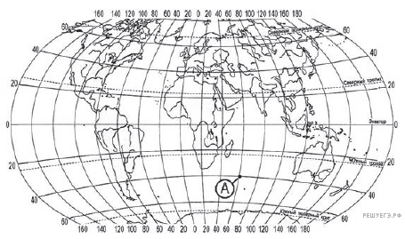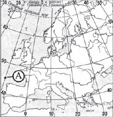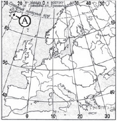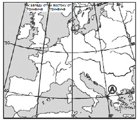 Пояснение. Точку А пересекает 40-я параллель и 20-й меридиан. Изображение на карте территории Европы, а также номеров параллелей 40 и 50 (к северу) указывает на Северное полушарие. На карте обозначен нулевой меридиан. Точка А расположена к востоку от него, следовательно, имеет восточную долготу.